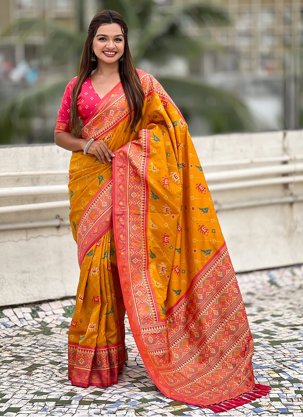 Yellow Patola Silk Trendy Saree Meenakari, Woven S16573