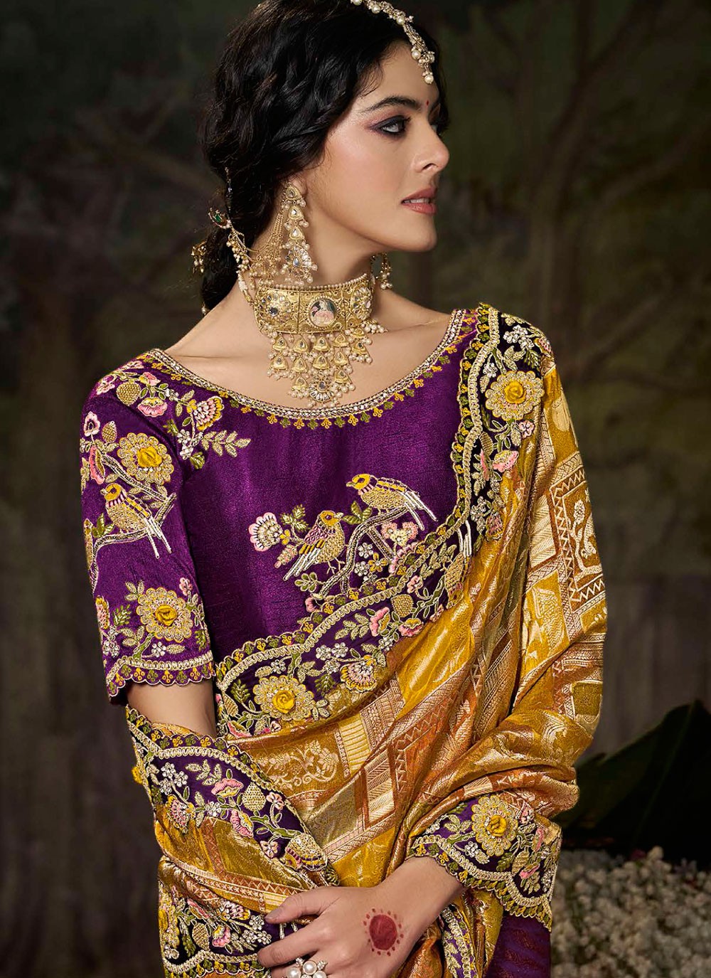 - Heavy embroidered sarees come with an unstitched blouse, with embroidery on one side only.