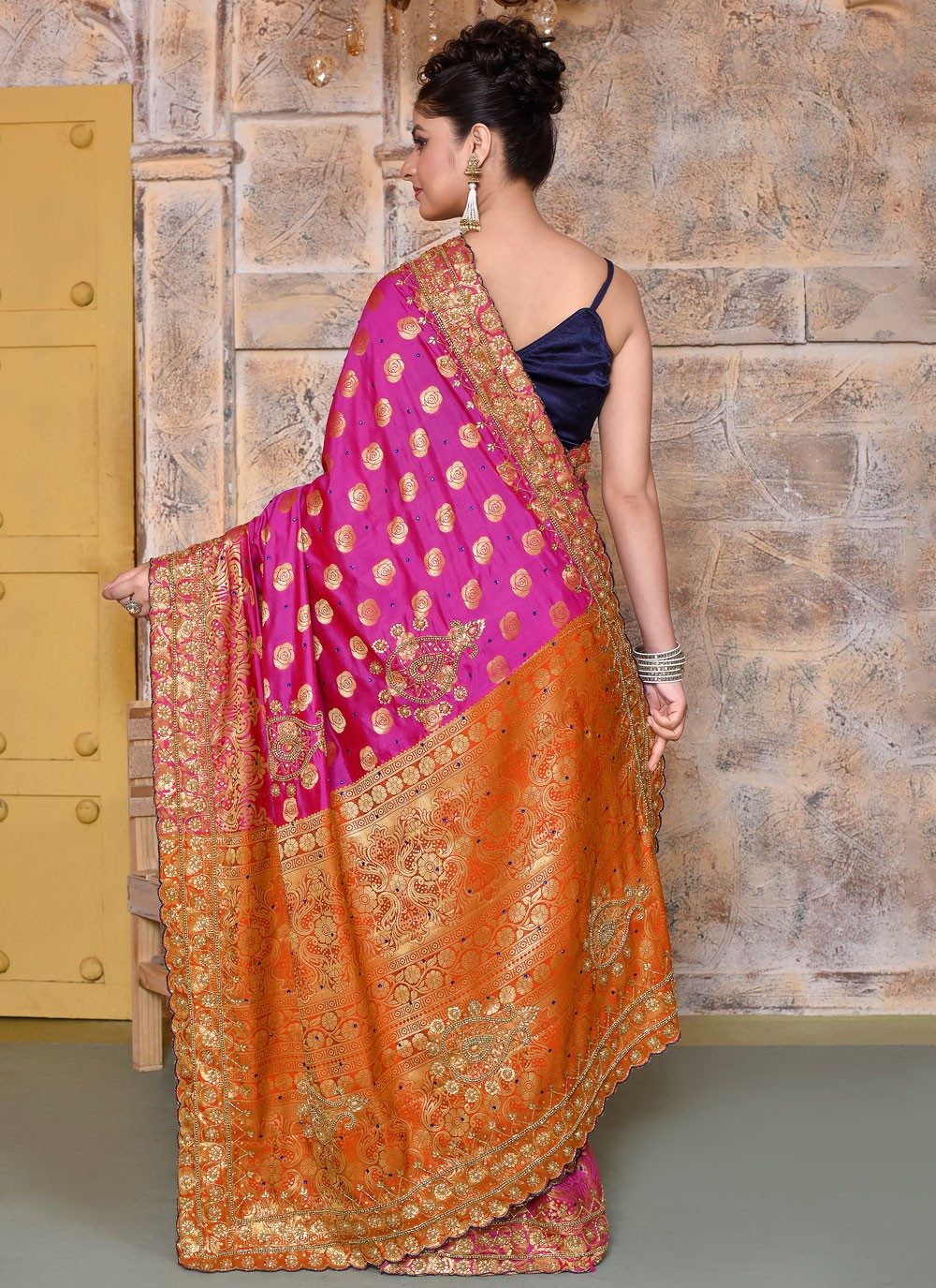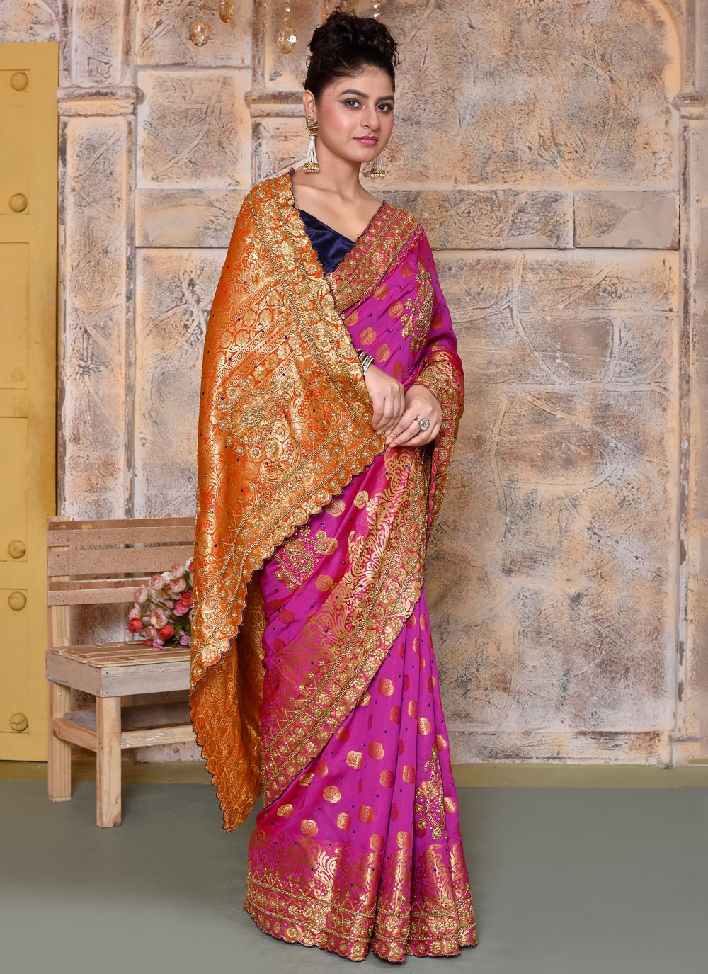 - Heavy embroidered sarees come with an unstitched blouse, with embroidery on one side only.