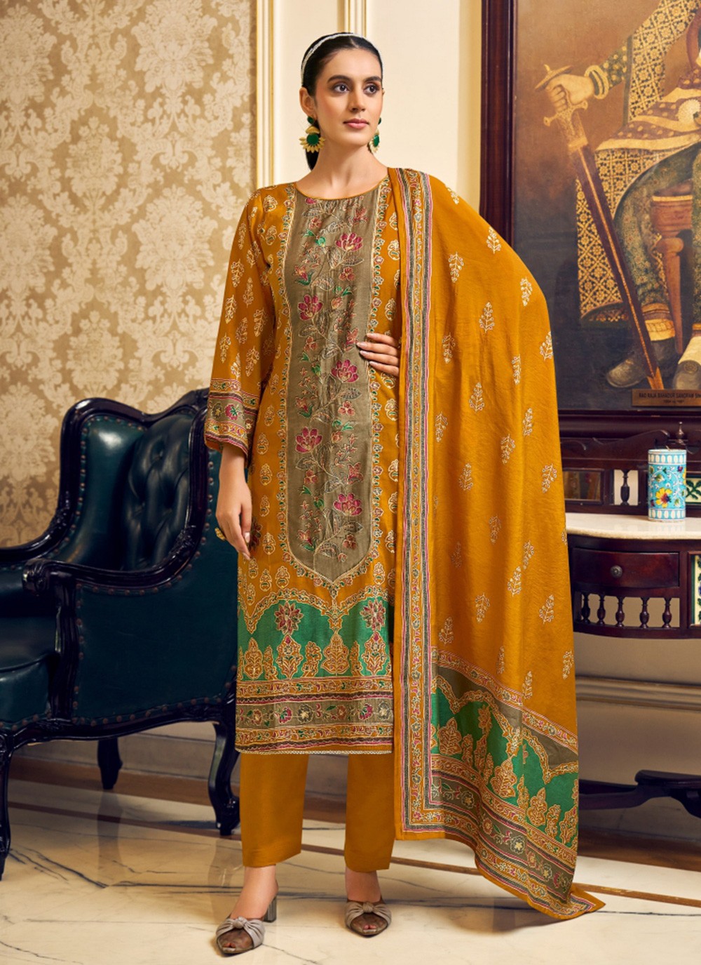 Salwar Suit Embroidered, Foliage Prints, Hand Embroidery Yellow T8054